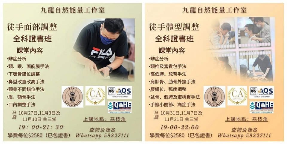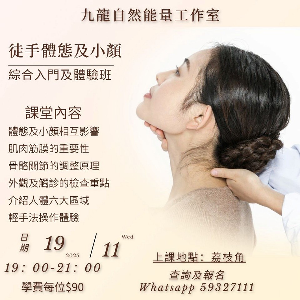 1)徒手小顏班:日期:2025年10月27日、11月3日及17日,19:00-21:30,合共3堂